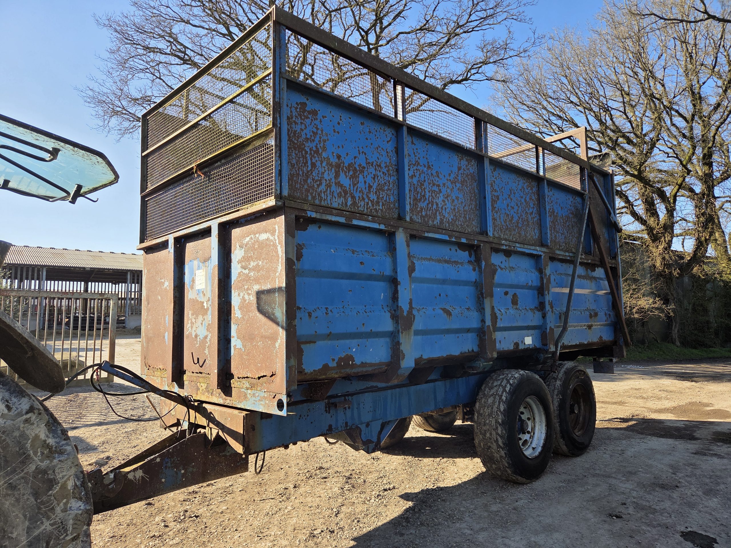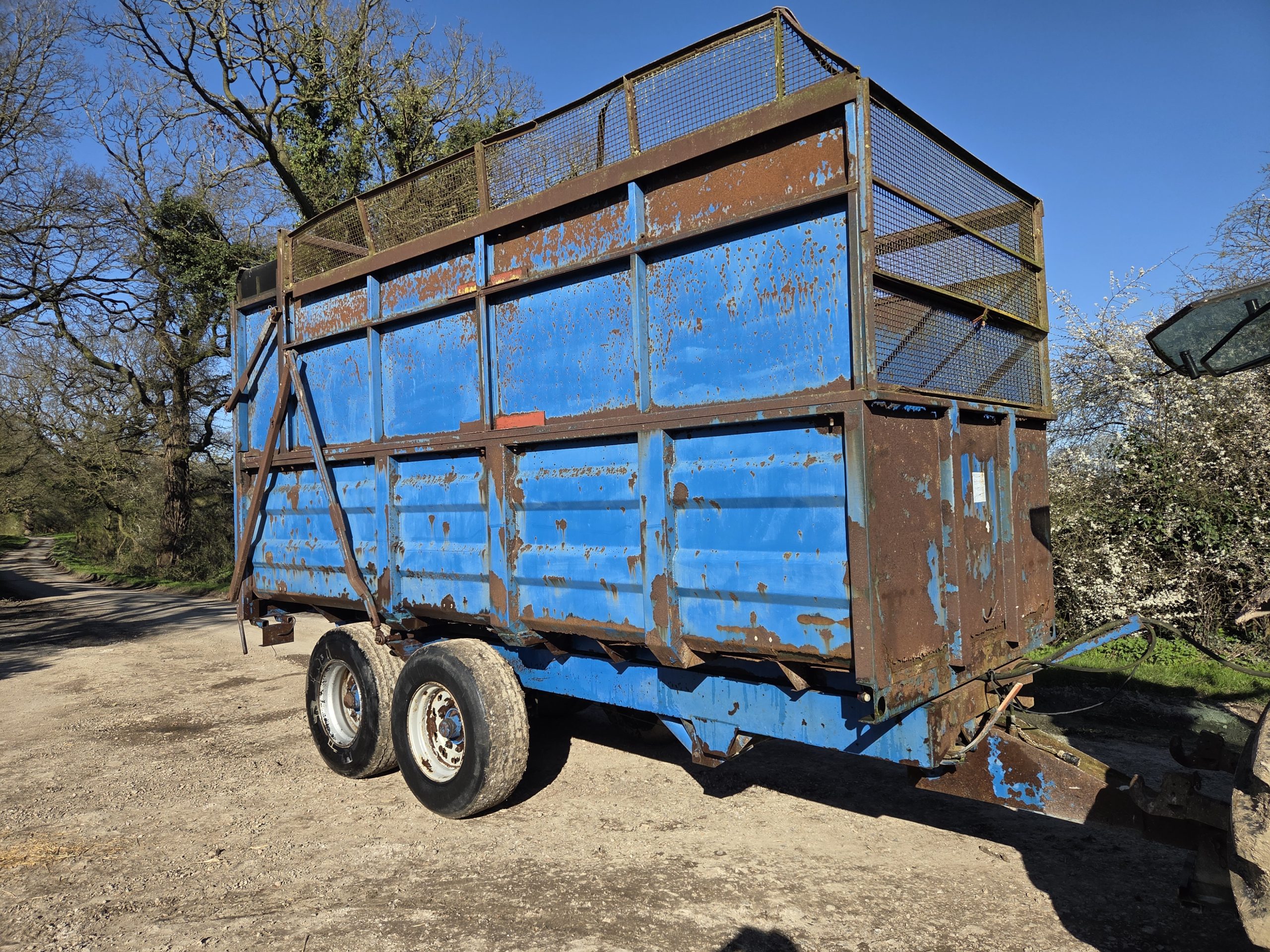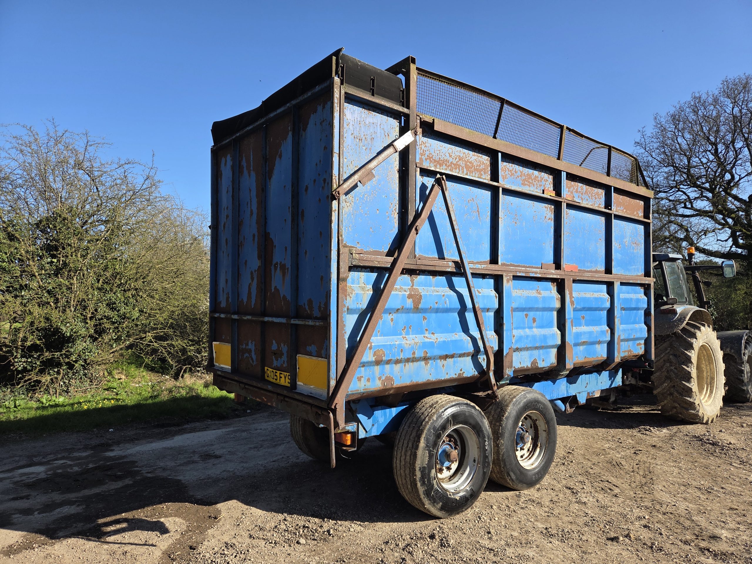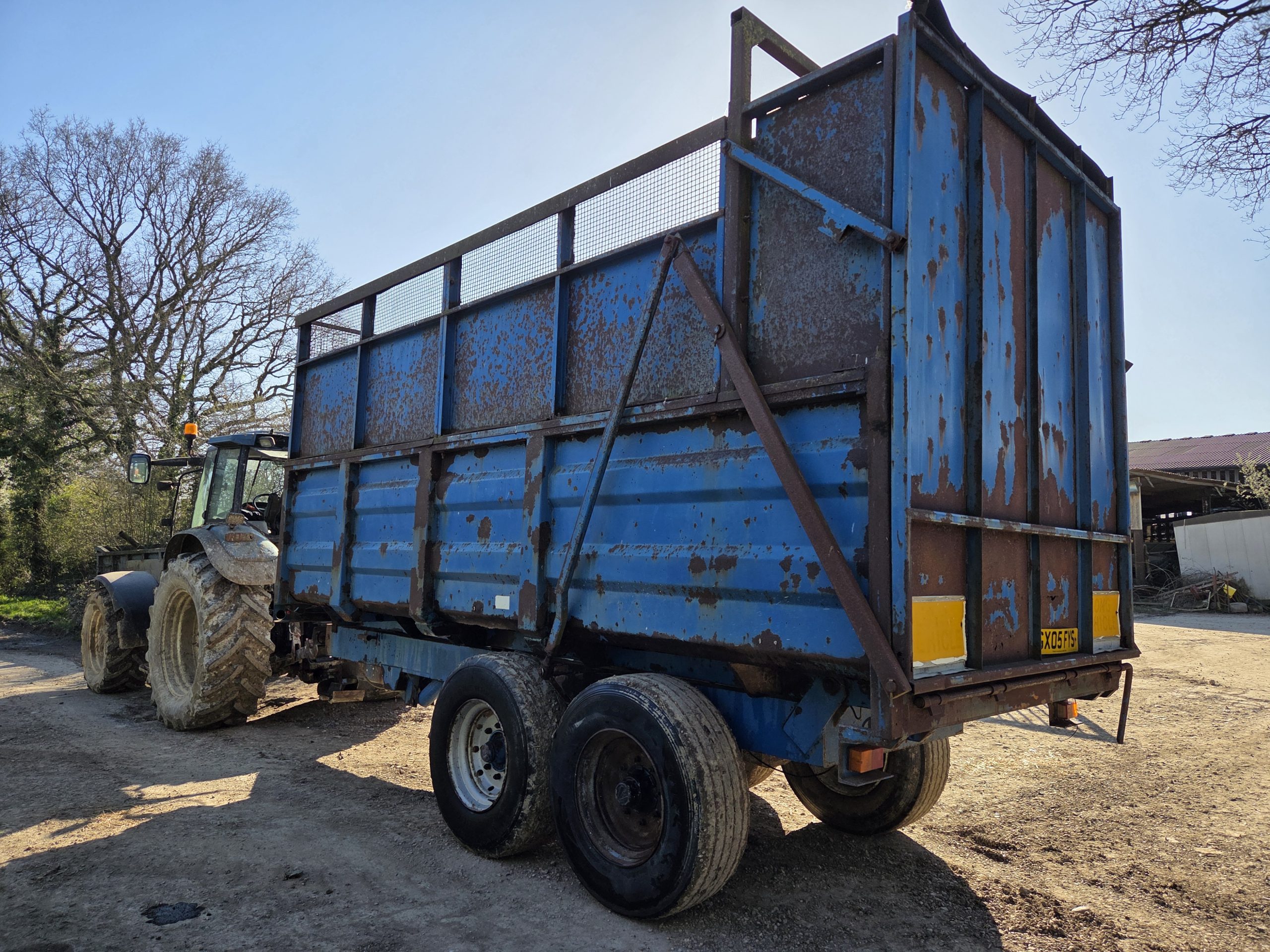 JH Ford 12 ton silage trailer, Sprung drawbar, 8 stud rocking beam, super single tyres, Automatic up + over tailboard, Hydraulic brakes, lights, ready to go.