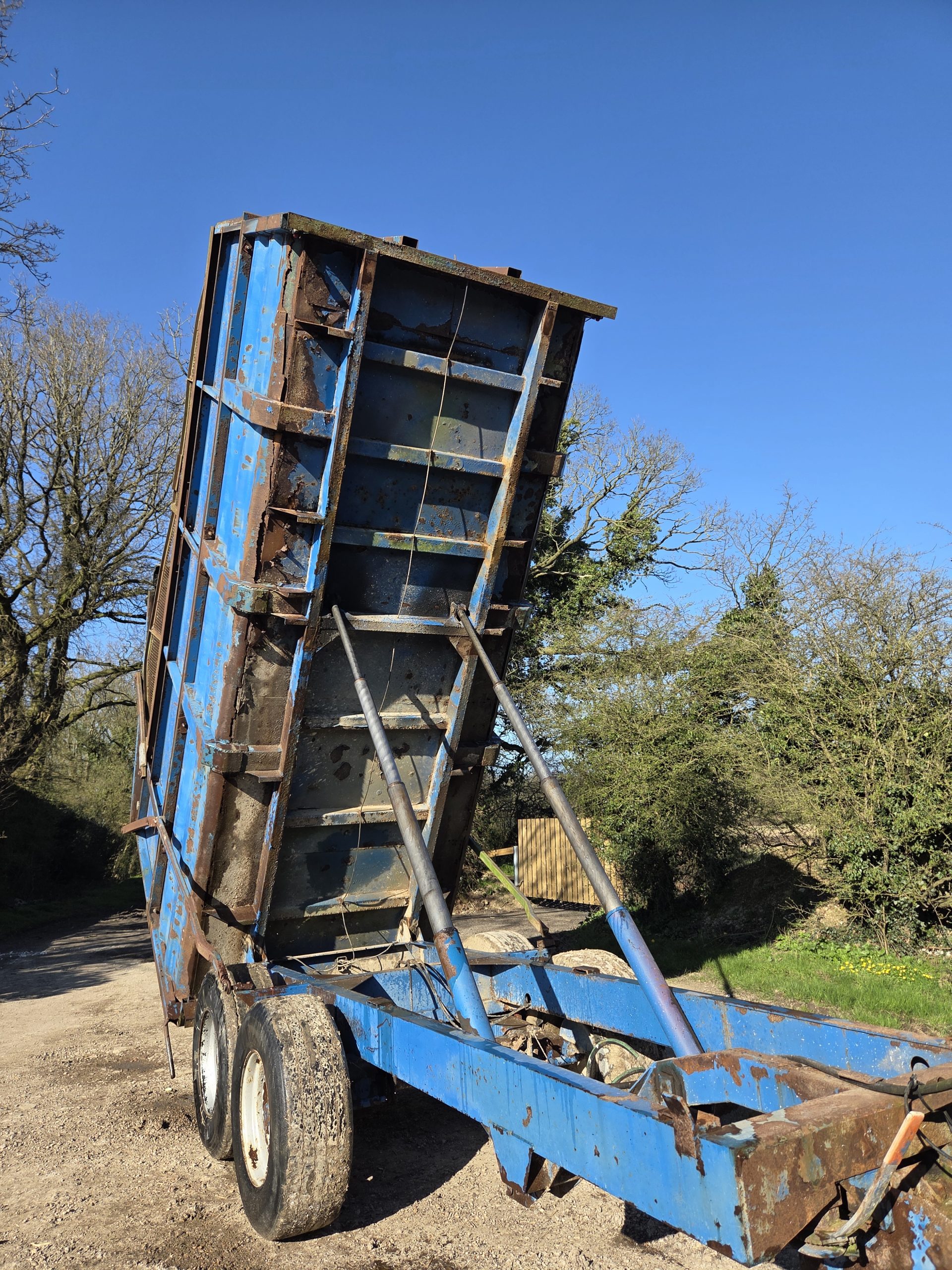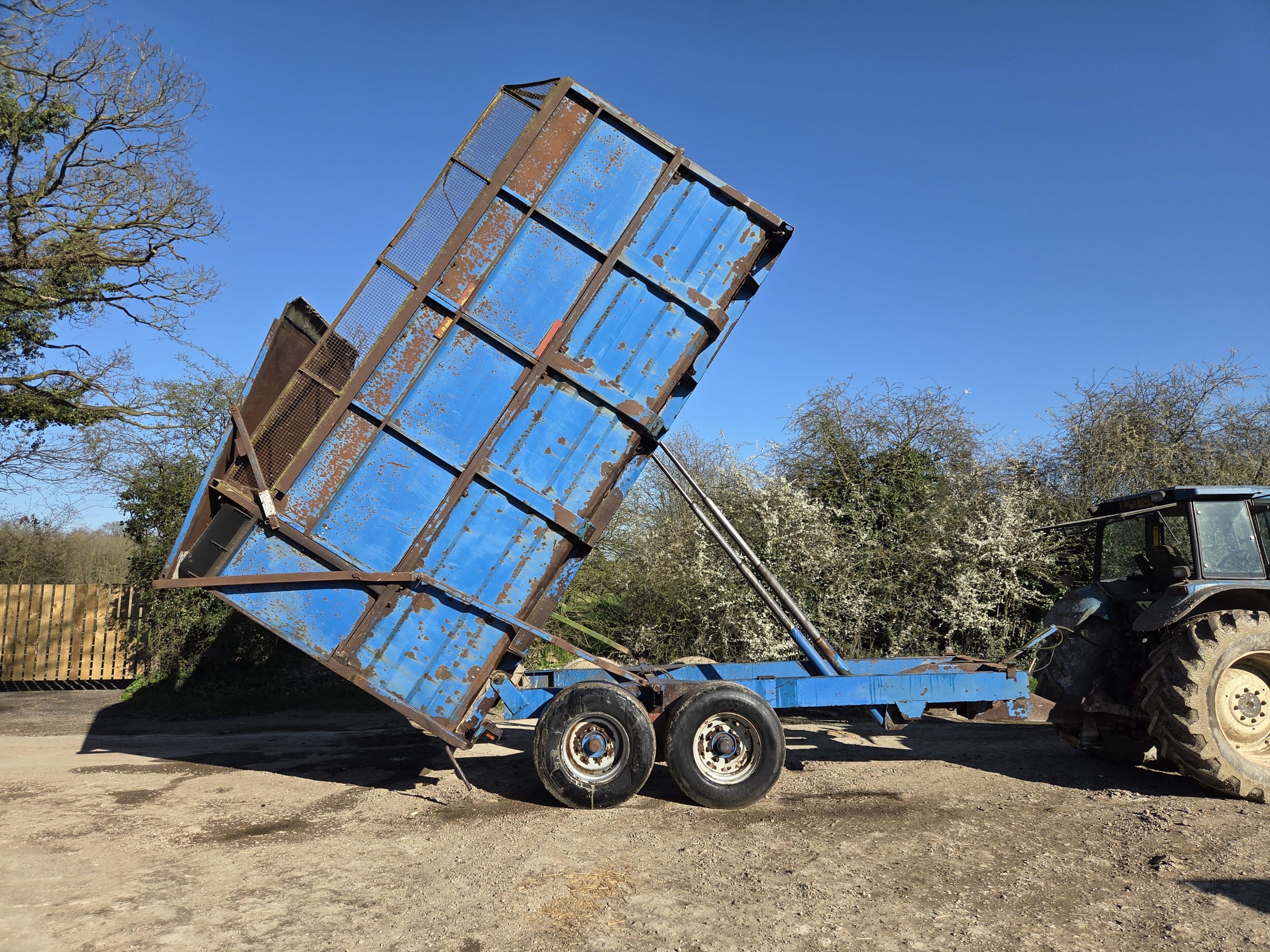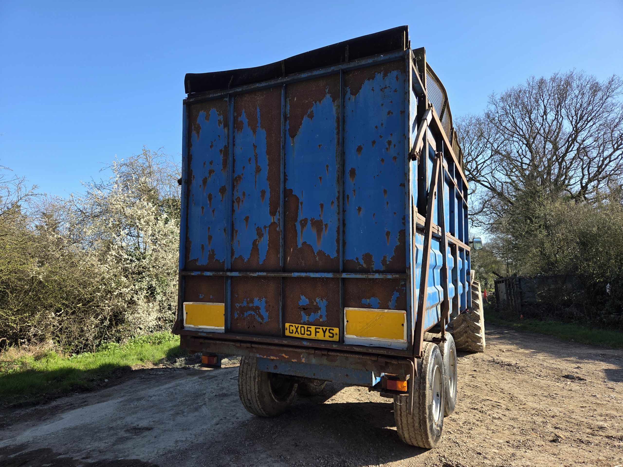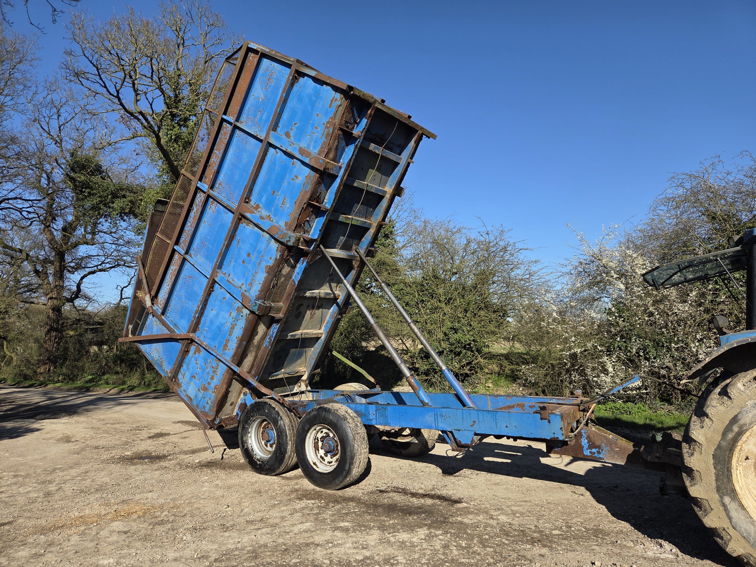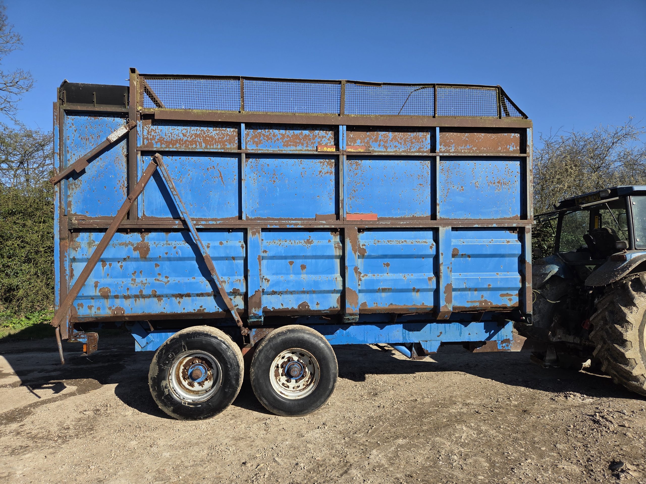 JH Ford 12 ton silage trailer, Sprung drawbar, 8 stud rocking beam, super single tyres, Automatic up + over tailboard, Hydraulic brakes, lights, ready to go.